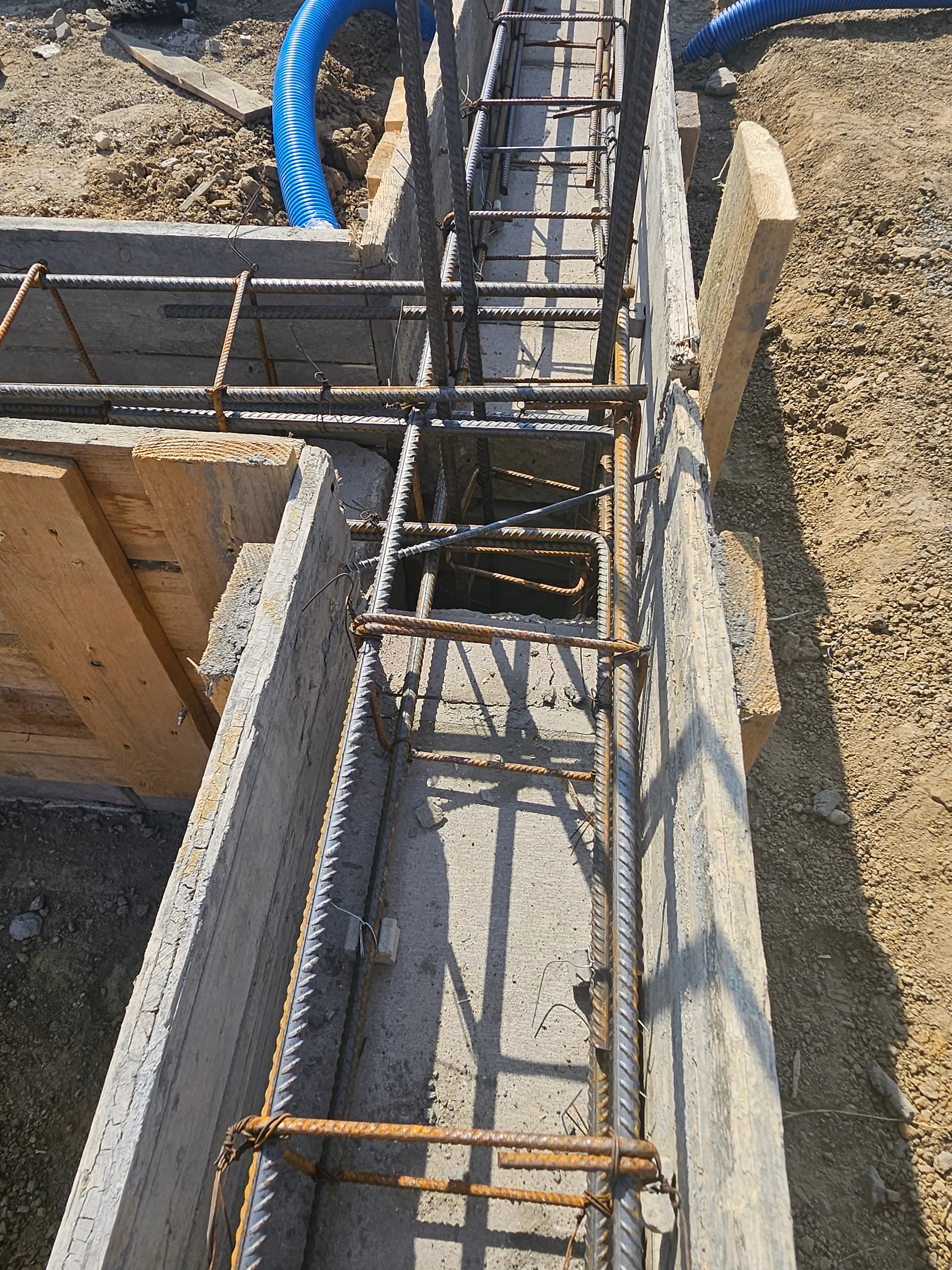 Ukończyliśmy zbrojenie fundamentów poprzez umieszczenie stalowych prętów w wykopach. Dzięki temu wzmocniliśmy konstrukcję, co zapewnia jej trwałość i odporność na obciążenia.