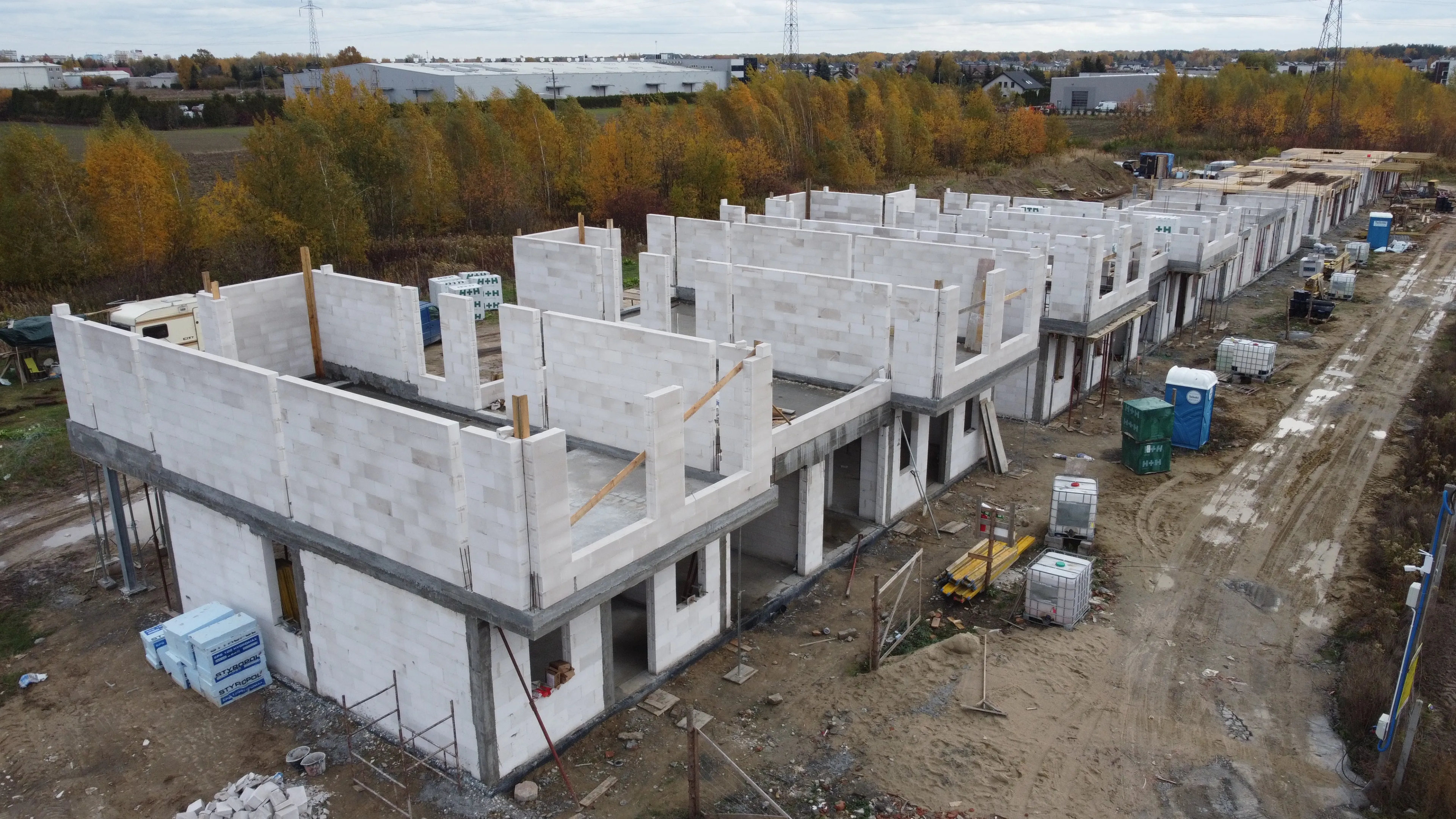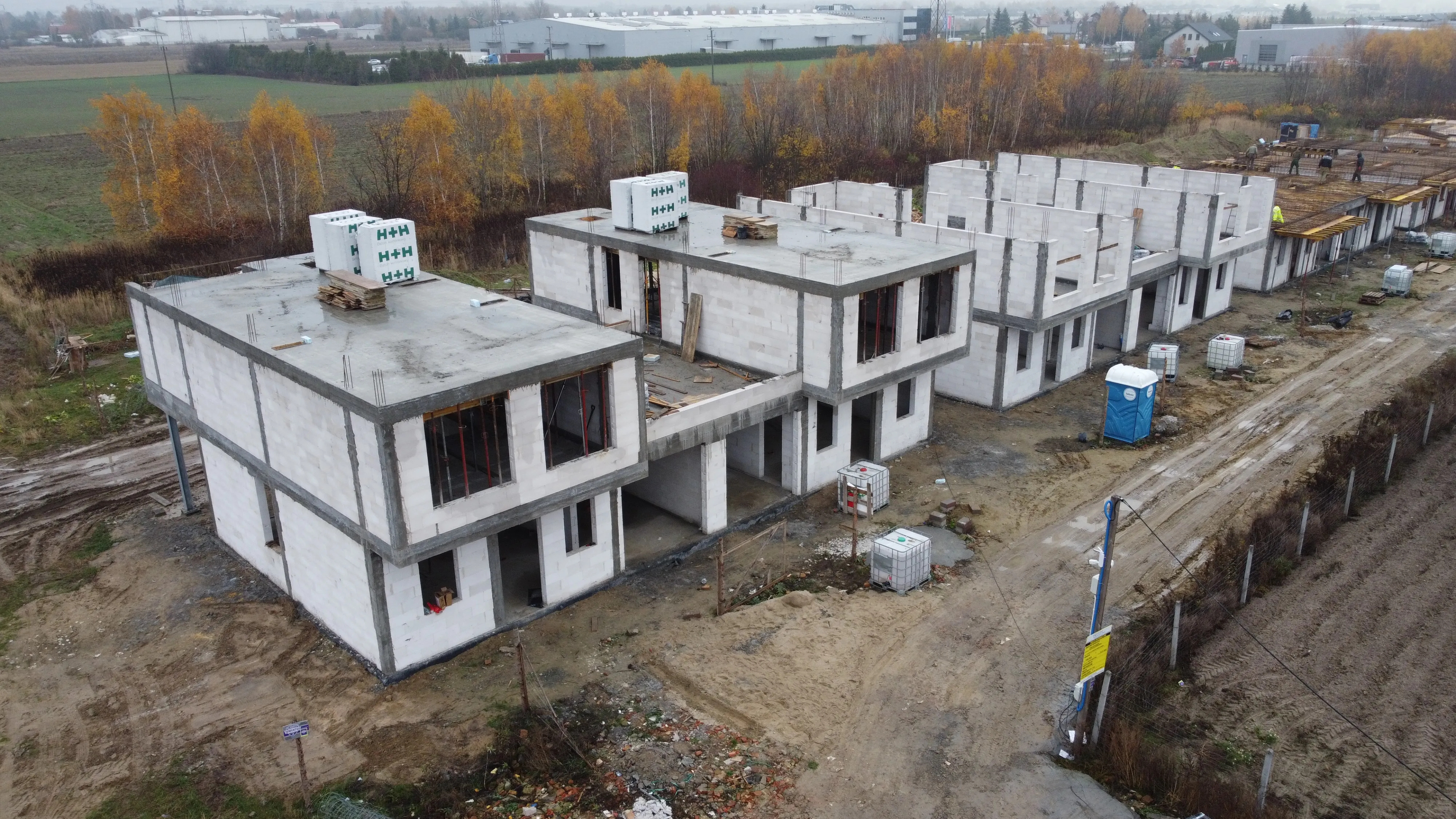 Sypialnie "już się robią". Budynki nabierają kształtu. Niebawem dach i prace w środku.